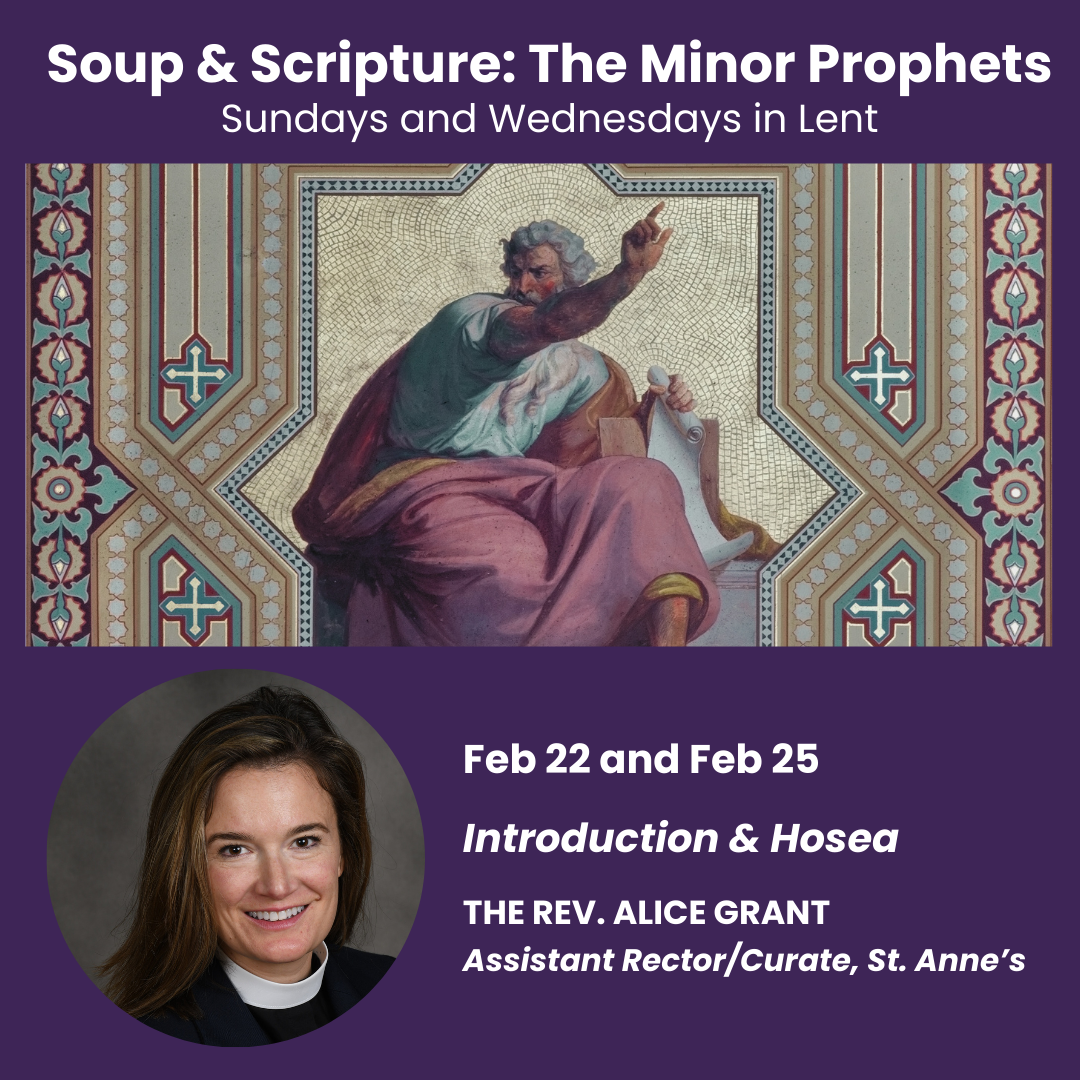 You are invited to Soup & Scripture: The Minor Prophets, a Lent Adult Forum series led by St. Anne’s clergy. We will gather from 11:30 a.m. to 12:30 p.m. in the Parish Hall to explore the Minor Prophets of the Hebrew Scriptures. These brief and sometimes overlooked books are ancient voices crying out for justice and repentance. Together, these minor prophets give us a glimpse of an ancient society’s collapse and rebuilding, all while pointing toward hope.