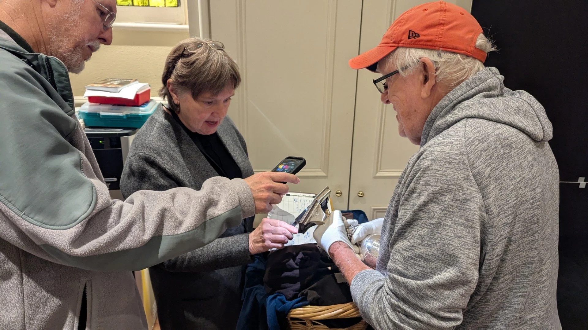 Jay Thomas, Terrie Hruzd, and Dave Fischvogt examine the markings on a silver chalice