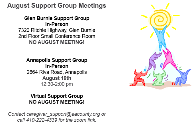 The Glen Burnie and Virtual Support Groups will not be meeting in August.